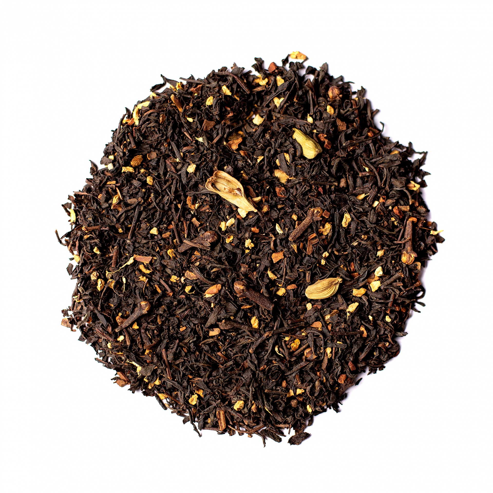 Composição: Chá preto (72%), canela (10%), gengibre, cravo (3%), cardamomo verde, sementes de cardamomo (1%), pimenta preta triturada (1%), aroma.