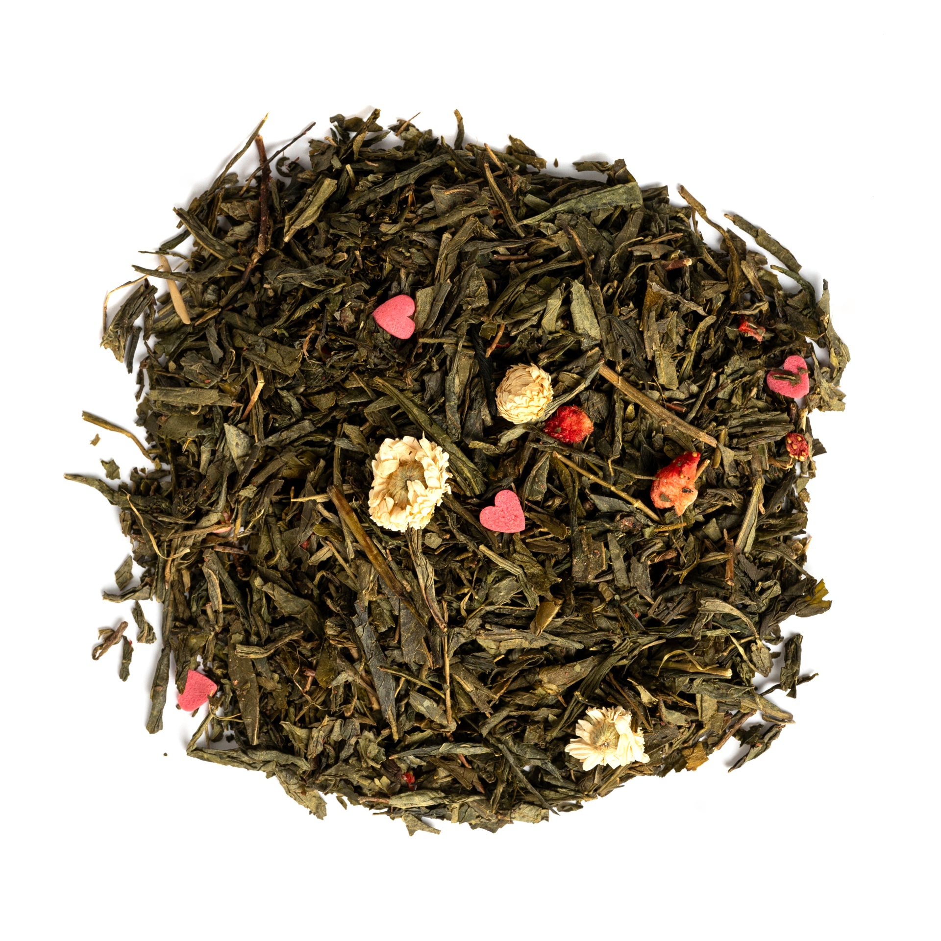 Composição: Chá verde Sencha (93,5%), morango liofilizado (1%), corações de açúcar (açúcar, farinha de arroz, óleo de AMENDOIM hidrogenado, fécula de batata, corantes: ácido carmínico, caroteno, aromatizante), aroma. Tempo de preparação: 3 a 4 minutos.