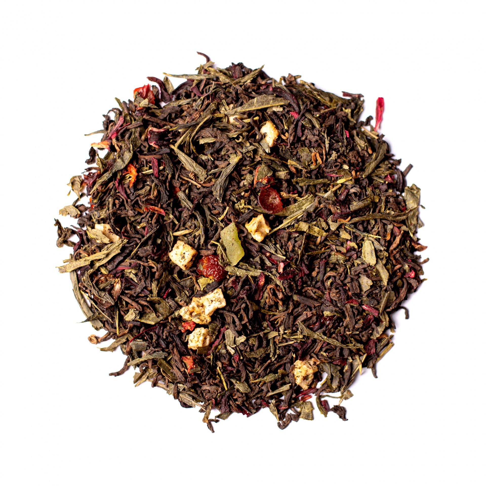 Composição: Chá vermelho Pu Erh (45%), chá verde Sencha, hibisco cortado, kiwi (kiwi (56%), açúcar, acidulante: ácido cítrico, corante: E141, antioxidantes: DIÓXIDO DE ENXOFRE), maçã (maçãs (aprox. 97,5%), sal, ácido cítrico E 330, ácido ascórbico opcional E 300), cinórrodo, morango liofilizado, aroma.