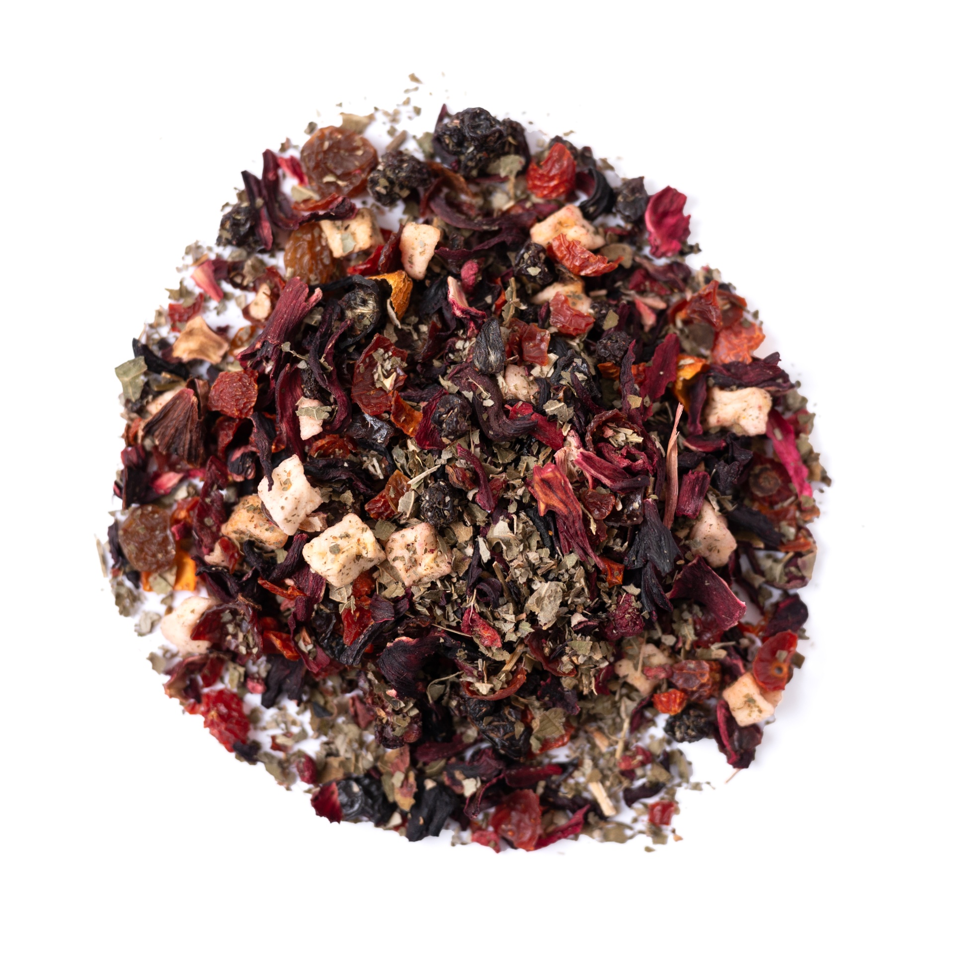 Composição: Corte de hibisco, roseira brava, passas, corintos, maçã (9%), folha de amora (5%), framboesa liofilizada (1%), morango (0,5%), aroma. Tempo de preparação: 5 a 7 minutos.